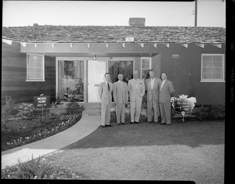 Opening of housing tract with model home selling for $20,500, with group gathered in front of house. with 1 variant