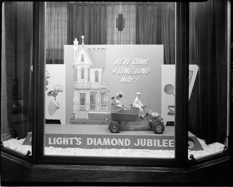 General Office display window - "It's Time To Celebrate - Light's Diamond Jubilee - 75 Years of Electrical Progress".