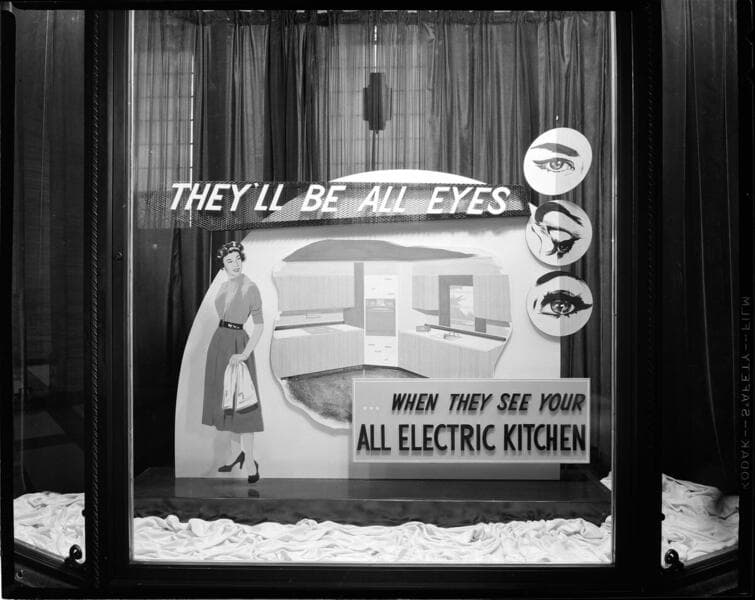 General Office display window - "All Electric Home - Be sure your new home is guaranteed by this medallion - Built-in Electric Kitchen"