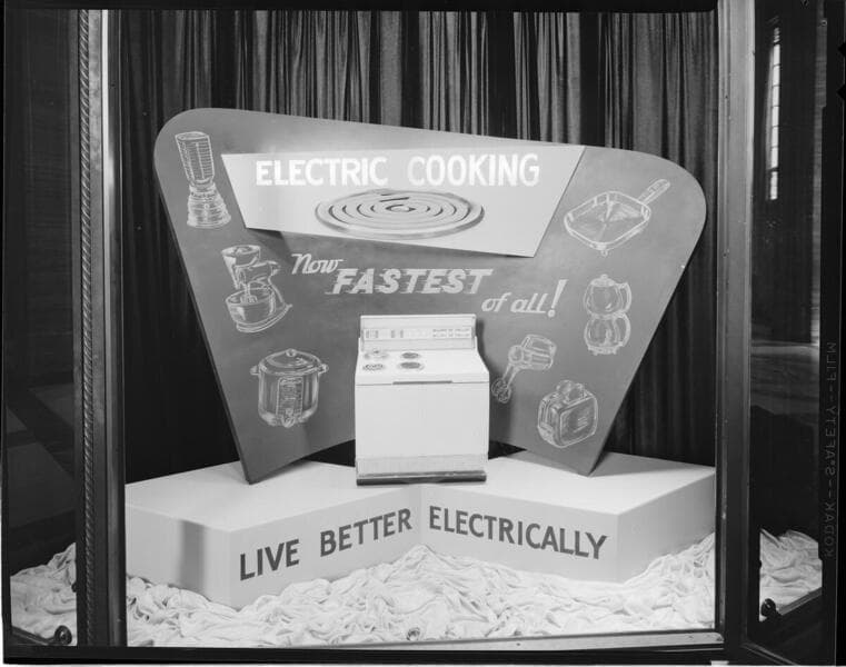 General Office display window - "Cool - Clean; and Fastest Of All! - Electric Cooking - Live Better Electrically"