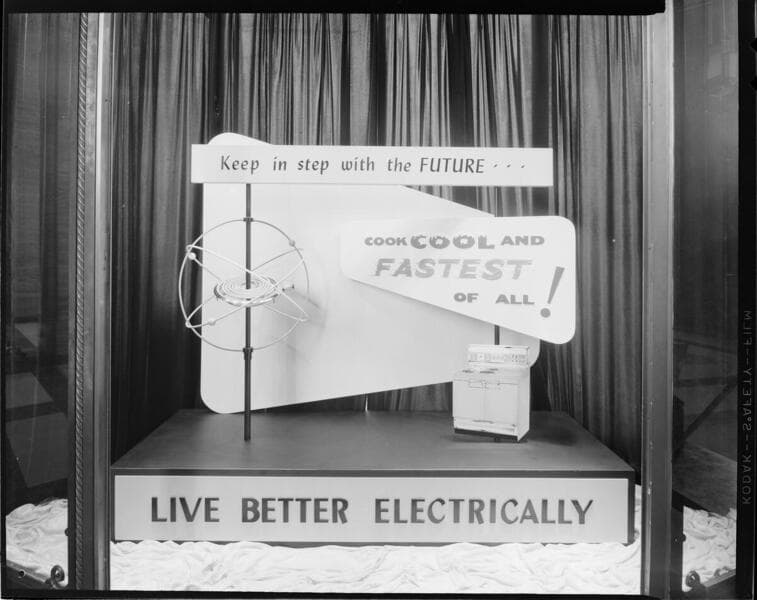 General Office display window - "Cool - Clean; and Fastest Of All! - Electric Cooking - Live Better Electrically"