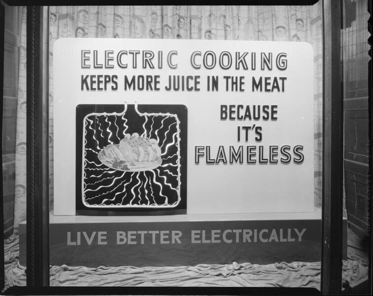 General Office display window - "Flameless Electric Cooking Keeps Meat Juicier- Live Better Electrically"