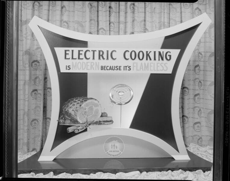 General Office display window - "Flameless Electric Cooking Keeps Meat Juicier- Live Better Electrically"