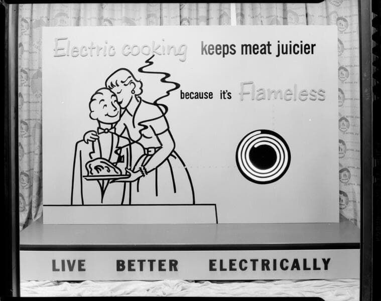 General Office display window - "Flameless Electric Cooking Keeps Meat Juicier- Live Better Electrically"