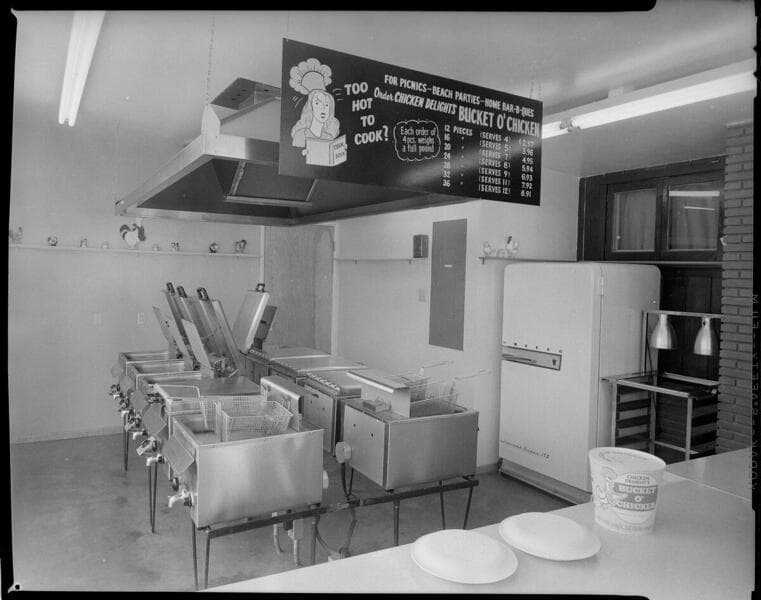 Chicken Delight take-out store with people preparing chicken dinners