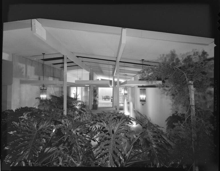 Opening of housing tract with model home selling for $20,500, with group gathered in front of house. with 1 variant