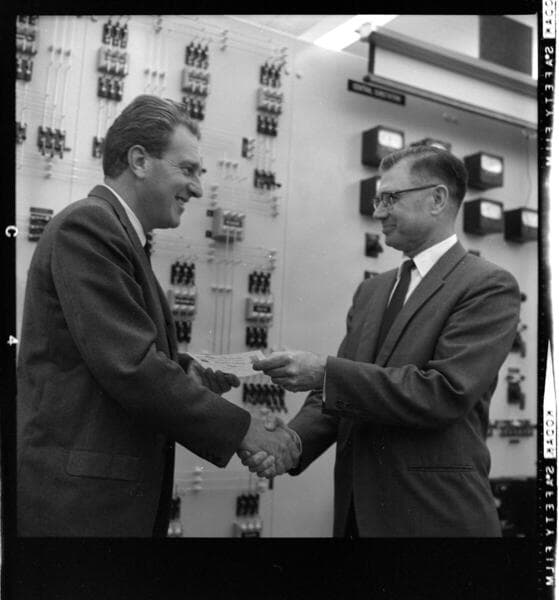 [Nine men in a substation control room receiving certificates of completion for Edison's Substation Operators School] [with 21 variants]