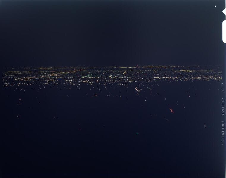 Cityscape at night showing streetlights of West Los Angeles. Looking north to Santa Monica from Palos Verdes Peninsula. [color, trans.]