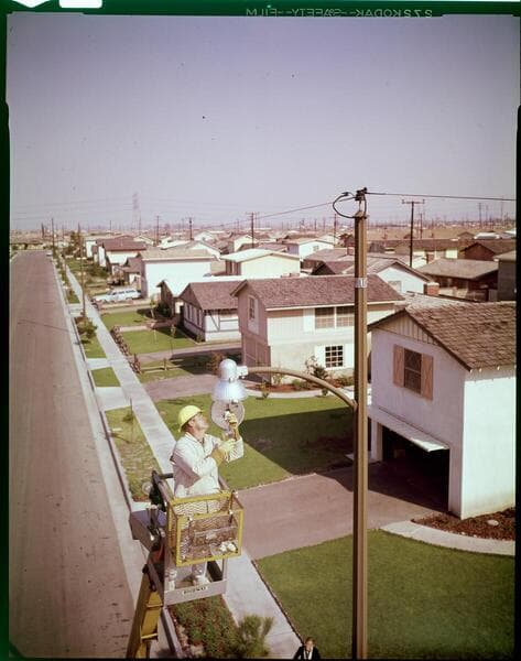 [Street lights in a residential community, and street & parking lot lighting at the Rosemead General Office and local commercial areas.] [with 5 variants]