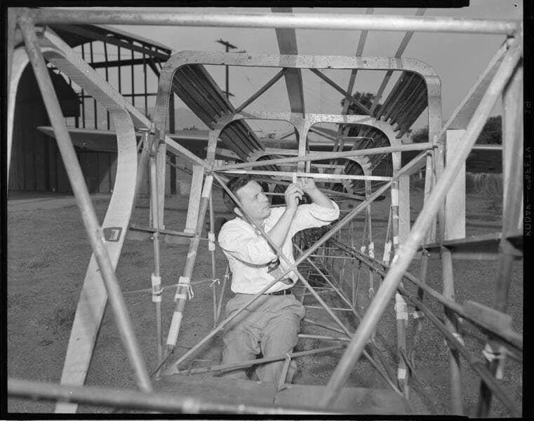 Man working on airplane frame with 2 variants of man with single engine airplane