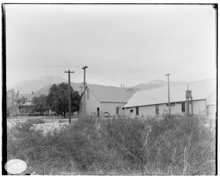 The construction of Mill Creek #3 Hydro Plant, showing the San Bernardino mountains in the background, ca. early 1902.