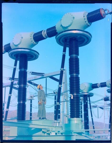 A substation maintenance man stands beside one of the new 500kV air circuit breakers at Vincent Substation. Pg. 224.