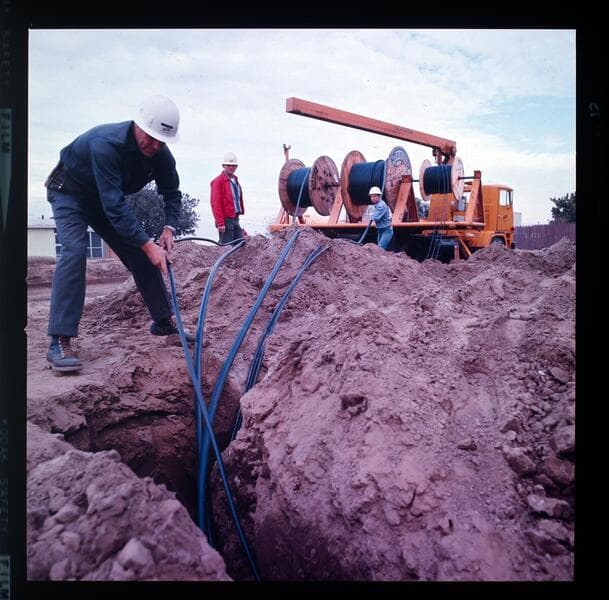 [Linemen installing transformer in underground vault - men working in substation racks and on large oil circuit-breakers - man soldering electronics and testing in control room] [with 16 variants]