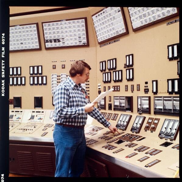 San Onofre Nuclear Generating Station - Unit 1 Control Room - Operator at control room switchboard going through final testing for Unit 1