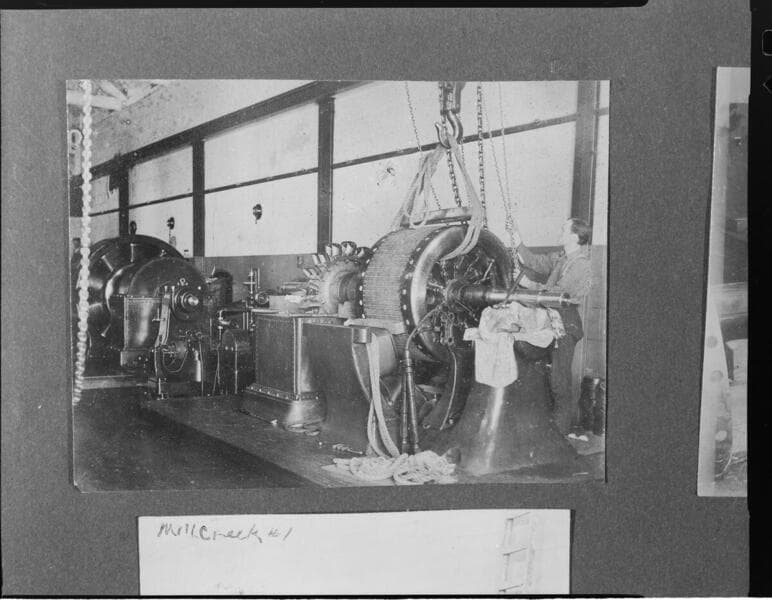 Mill Creek 1, 2&3 Powerhouse - The interior of Mill Creek #2&3 Powerhouse [showing the Pelton wheels, generators, and switchboard.]