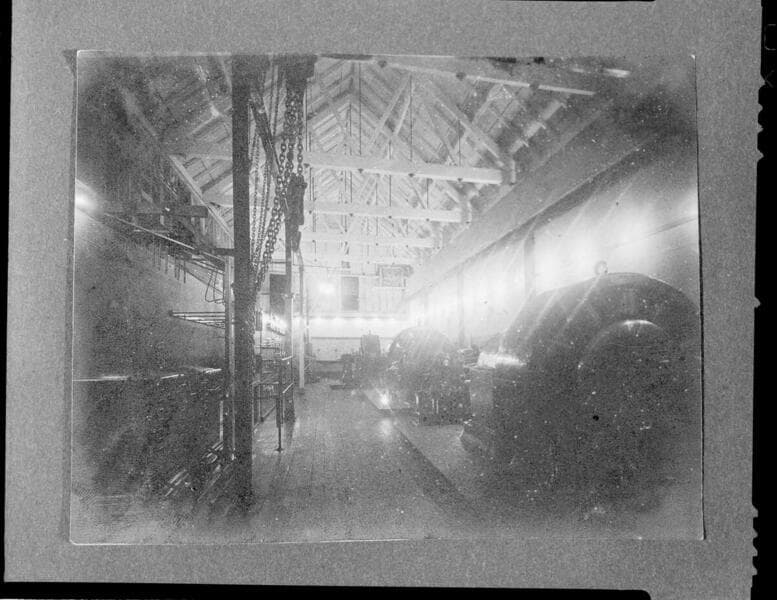Mill Creek 1, 2&3 Powerhouse - The interior of Mill Creek #2&3 Powerhouse [showing the Pelton wheels, generators, and switchboard.]