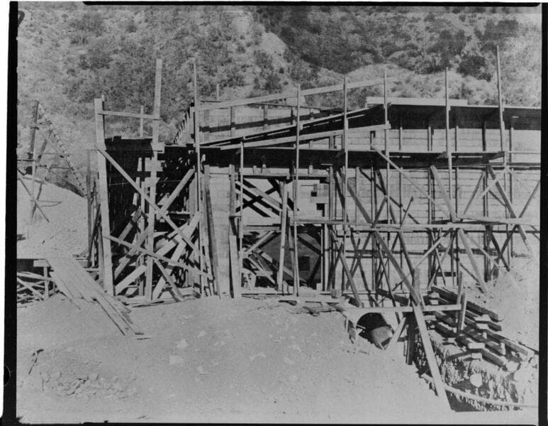 The raceway flume joining the tailrace of Mill Creek #2 Hydro Plant and Mill Creek #3 Hydro Plant with the intake of Mill Creek #1 Hydro Plant. [showing the mountains and the canyon.]