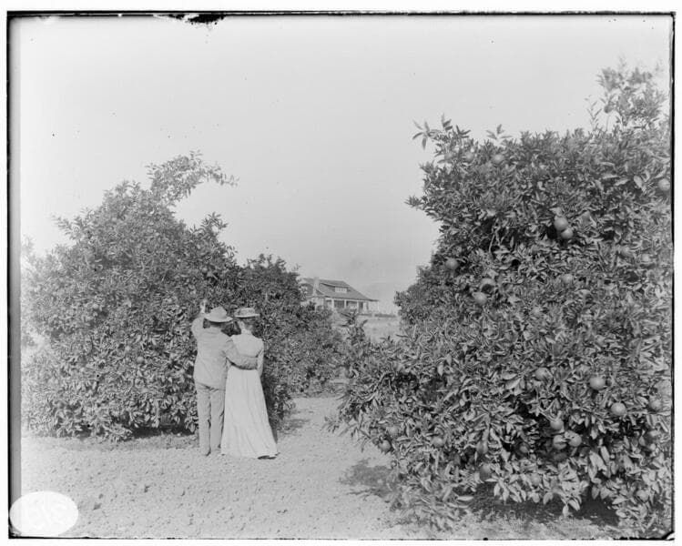Image of a giant pepper tree dwarfing a couple strolling at left and a couple riding in a horse-drawn carriage at right; orange grove and mountains in background.