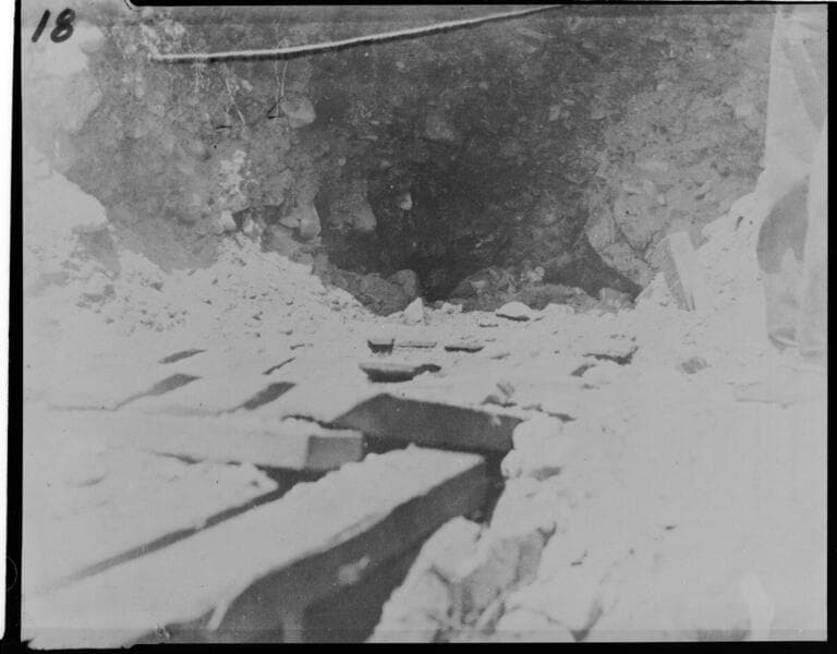 Mill Creek #3 - Three construction workers sliding stone into the intake tunnel.