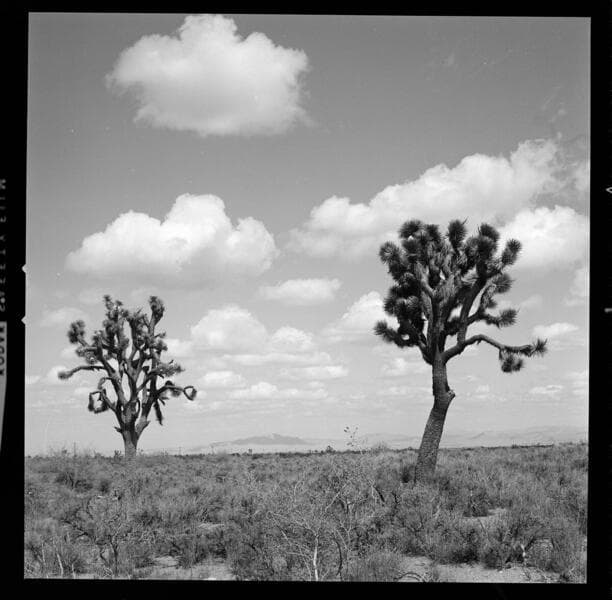 Bishop & Hoover tower line through desert Joshua Tree woodland