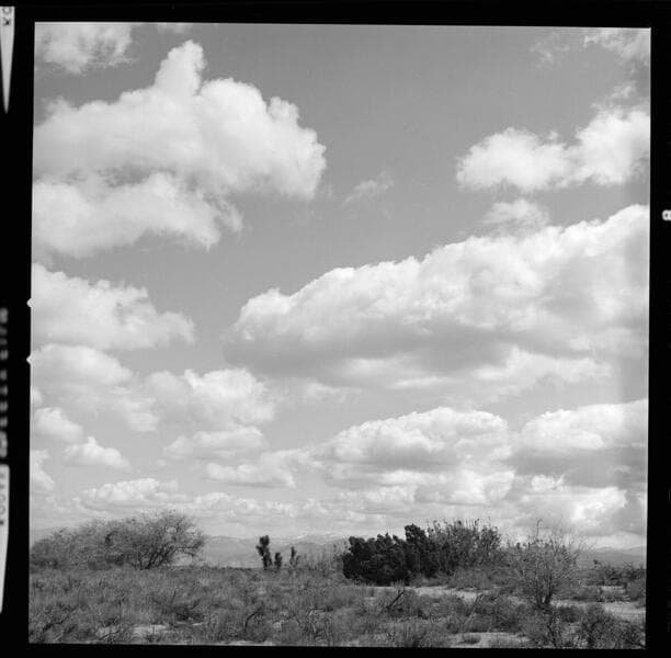 Bishop & Hoover tower line through desert Joshua Tree woodland