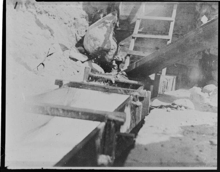 Mill Creek #3 - Three construction workers sliding stone into the intake tunnel.