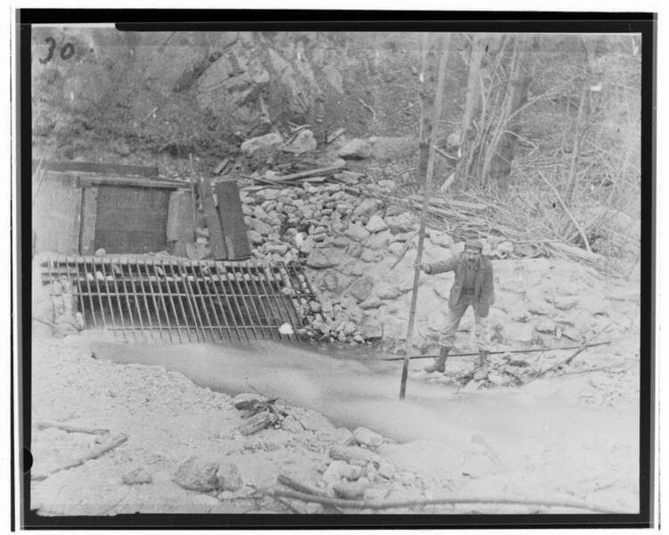 A man tending to the cave--in at the intake at Mill Creek #3 Hydro Plant
