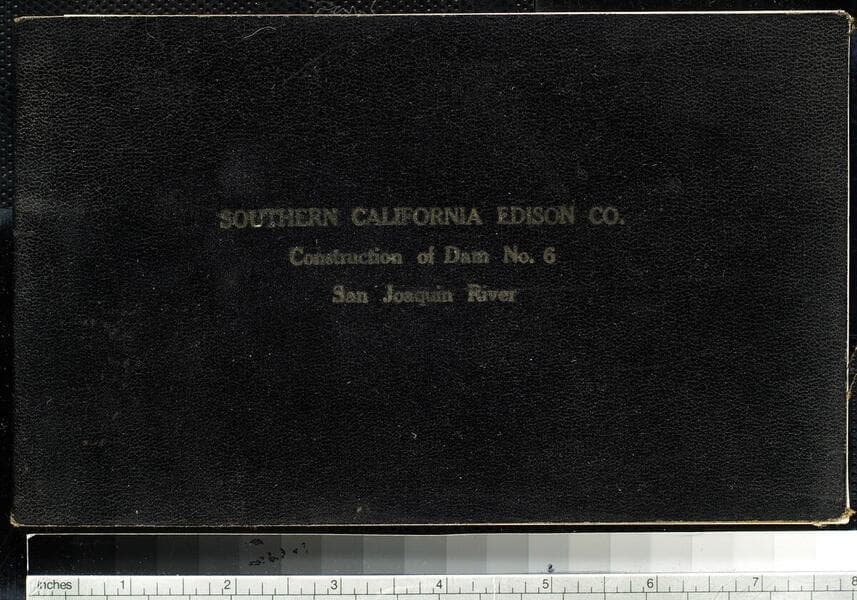 Album with a printed introductory page detailing the construction of Big Creek Dam No. 6 on the San Joaquin River, including dam site, abutments, drilling test cores in riverbed, and building the bypass flume.