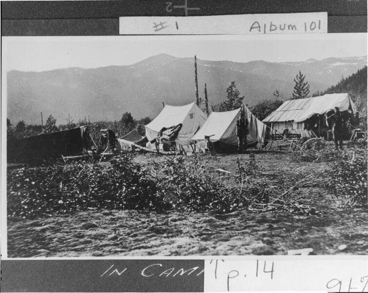 Dave Redinger entitled this picture "The Last Day in Camp at Dick Creek, Alaska." These engineers seem ready to return to the delights of "civilized" Seattle! One member of this group, George Parks, became a future Territorial Governor of Alaska.