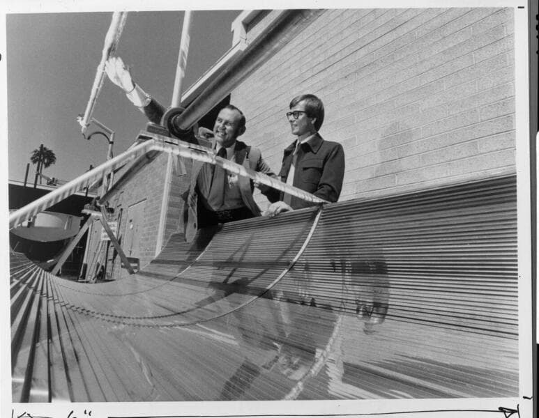 Engineers viewing detailed model of solar energy panels. Format of original: Reel