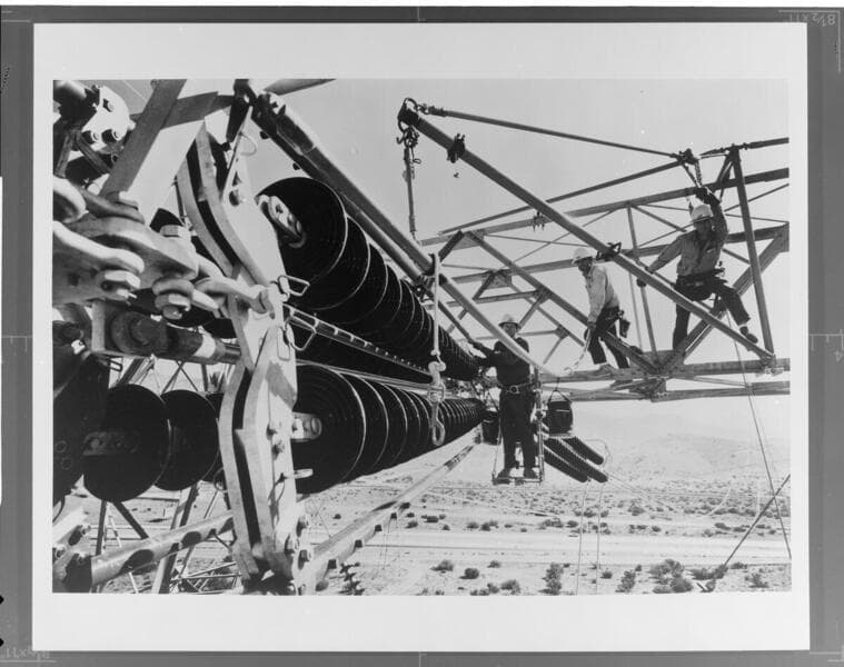 Edison Company linemen use a "shepherd's hook" tool to install a 500kV insulator on a Pacific Intertie tower