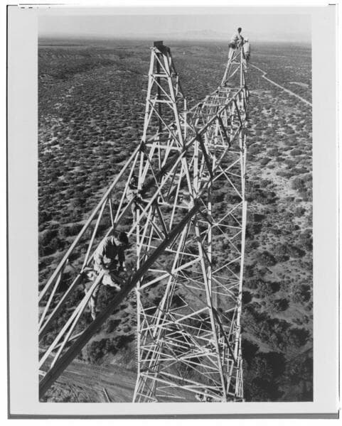 Dramatic view of the building of the Vincent-Lugo 500kV transmission line, part of Edison's bulk power "backbone"