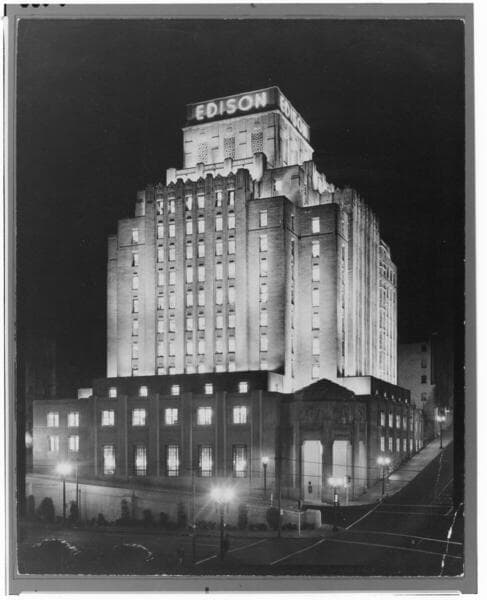 Night view of Edison Building (5th & Grand) - Lighting - Floodlighted 3am.