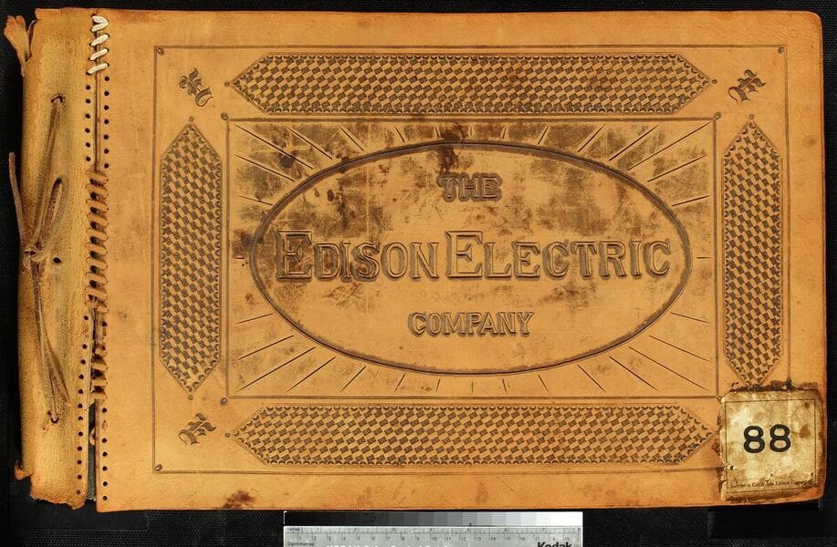 Album cover embossed with title "Edison Electric Company." Photographs of EEC facilities and operations, including Los Angeles Powerhouses No. 1, No. 2 and No. 3; EEC general office construction; Pasadena office; Santa Ana River No. 1 construction and operation; Edison Electric Co. plant in Pomona; Mill Creek No. 1 interiors; Santa Ana office; Pumping Plants and substations in Orange County; Redlands plant and office; Mill Creek 3 construction; Long Beach electric plant and gas plant; Santa Monica engine No. 1; San Pedro gas plant and office; Santa Monica Office, Steam Plant, and Gas Plant; Santa Barbara plants and offices; Long Beach plants and offices; San Bernardino; Colton; Kern River; Lytle Creek construction; Puente Substation and cottage; Ontario No. 1; Kern No. 1 construction; Castaic Substation; and Fernando Substation