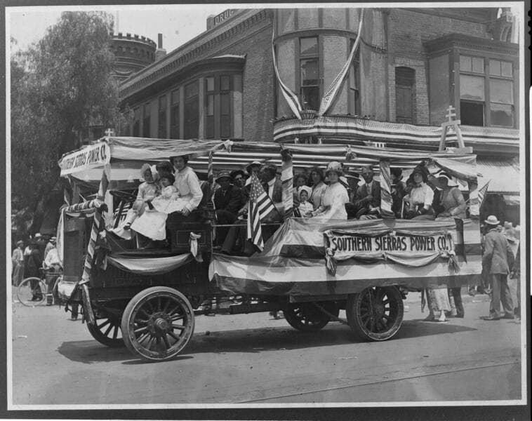 The Alco truck again, now carrying employees and their families in the Fourth of July parade in Riverside, about 1915