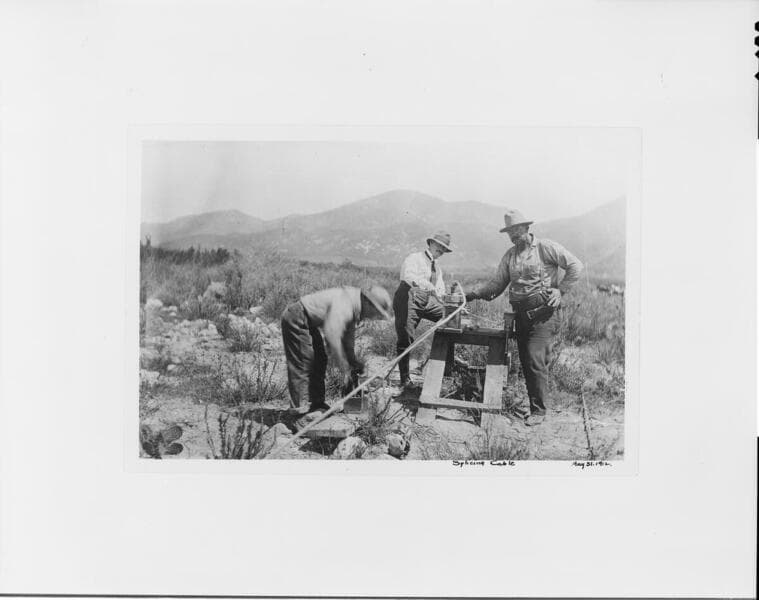 Making a splice in the aluminum and steel cable during construction of the tower line over Cajon Pass in May of 1912