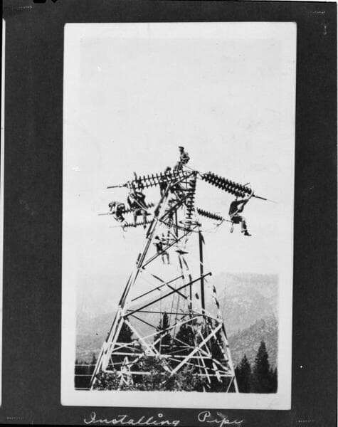 Big Creek Transmission Line - Raising Towers [for 220kV transmission] - all ready [men stationed at 4 wenches ready to raise tower].
