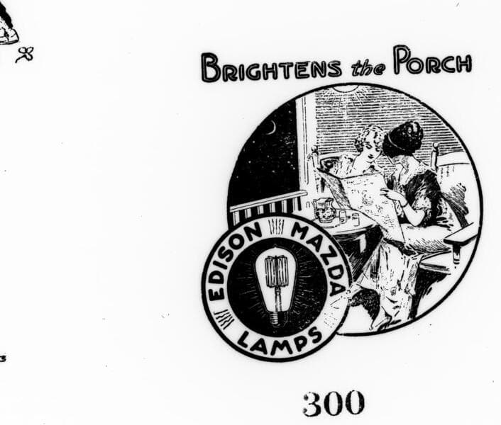 The Edison Mazda Lamp "Brightens the Porch". logo. similar to shot used in Iron Men & Copper Wires