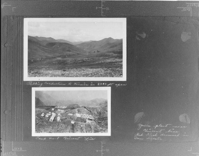 Tensioning conductors in 5260 foot span. ; Camp #8, Vincent line