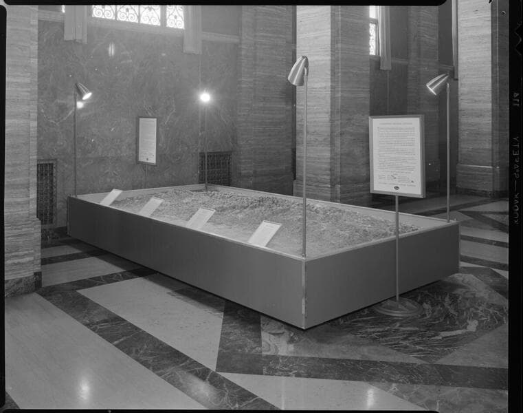 Large 3D relief map created by the Display Division showing hydroelectric development in the Sierra Nevada Mountains on display at the Edison General Office