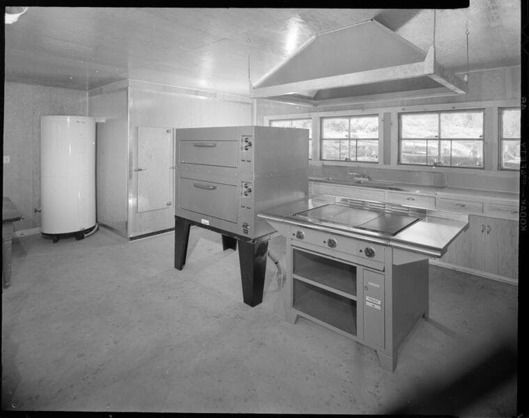 Black and white photograph of the exterior of a structure labeled "#4 Mary Lake cabin" in a wooded area of Vermejo Ranch. Accompanying map drawn on brown paper indicates the structure had 1 bedroom, a living room with fireplace, a kitchen, and a pantry. Notes indicate "roof bad, other condition - good."
