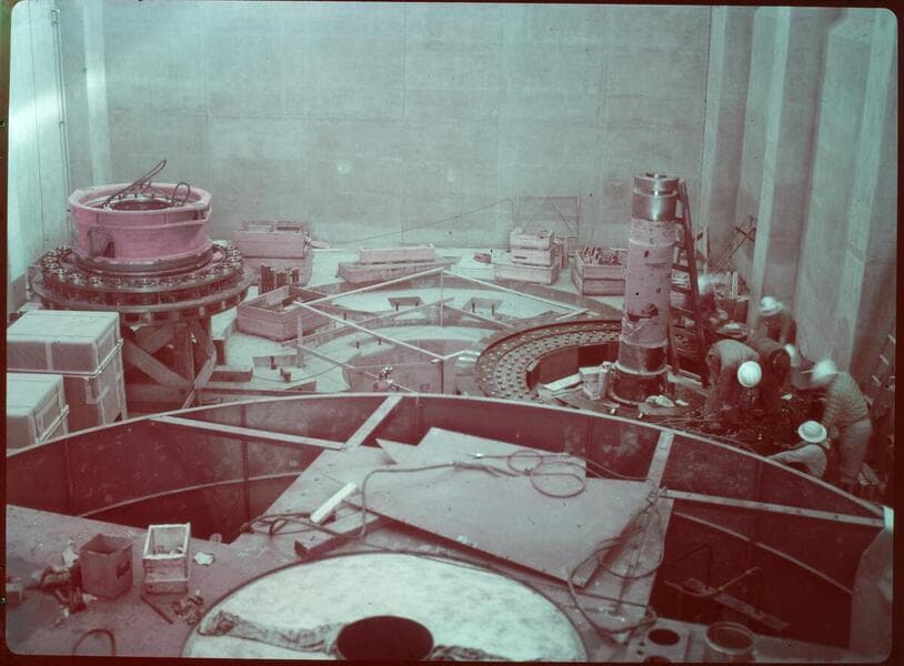 Big Creek #4 project: Construction shot inside Powerhouse #4. Workers are assembling one of the vertical axis, Francis turbine-