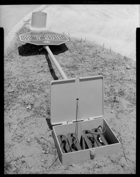 Booth displaying Atwater Kent radios for sale from the Pasadena Battery and Ignition Company. Sign on the right announces a competition in which participants guess the length of wire used in making the radio; the person with the most accurate guess wins a radio. Sign on left advertises opportunity to meet Uncle Remus at the Atwater Kent exhibit.