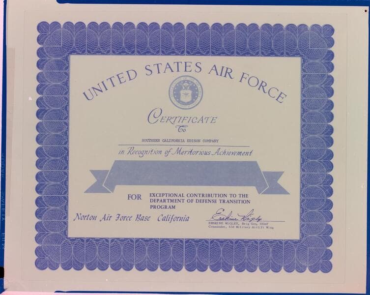 Certificate of Achievement award to SCE from Norton Air Force Base