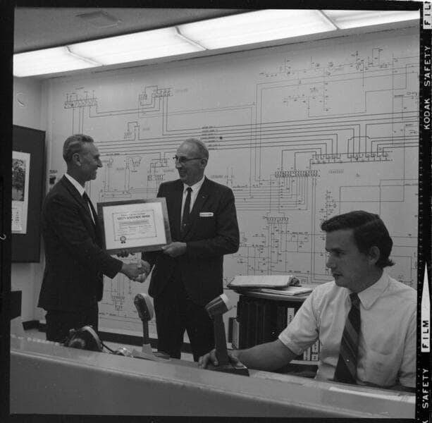 Safety award from EEI presented to SCE's Saugus Substation - Ray Klumb, (Manager of Substations) is older man in suit and glasses.