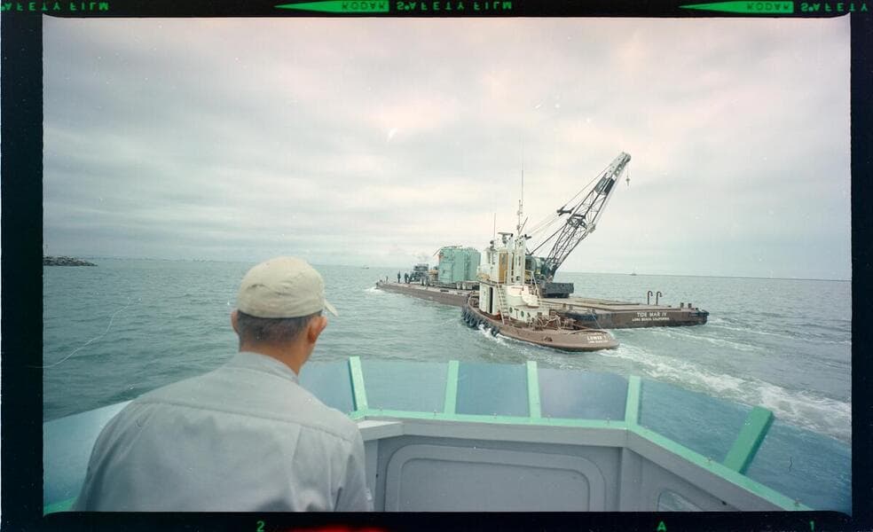 Long Beach Harbor - Transformers and a crane in transport on a barge pushed by a tugboat, as viewed from a following boat.