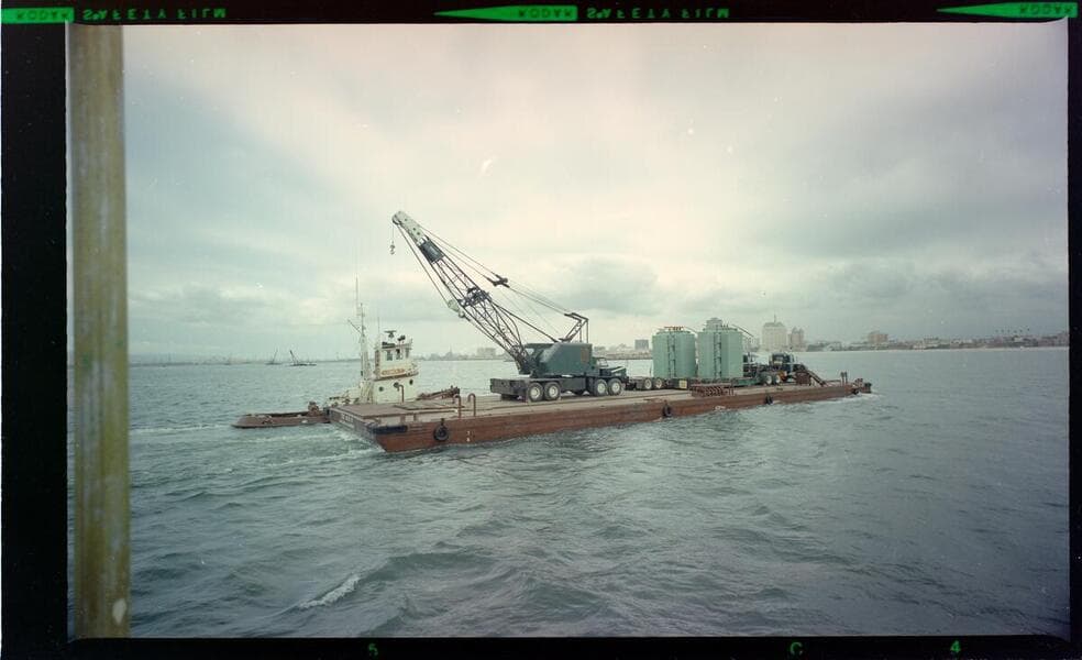 Long Beach Harbor - Transformers and a crane in transport on a barge pushed by a tugboat, as viewed from a following boat.