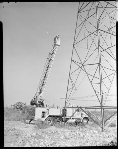 Lineman washing tower insulators from bucket with high pressure nozzle.
