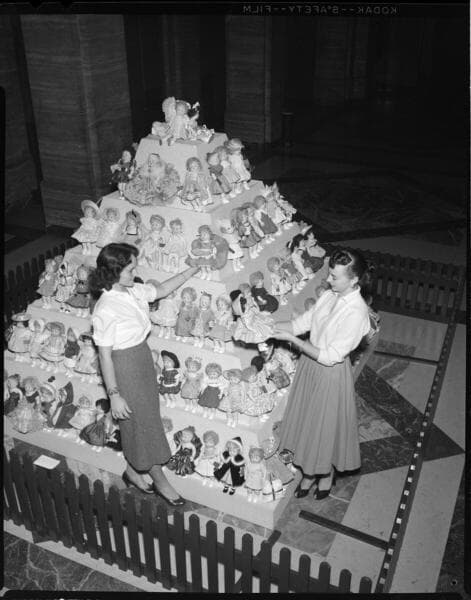 Window display of dolls produced in the 1932 Christmas Doll Contest. Dolls are given to needy children at Christmas.