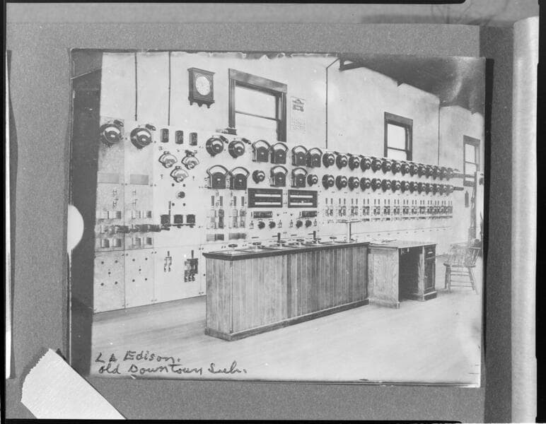 The control board for the DC system at Los Angeles #2 substation. ca. 1903-